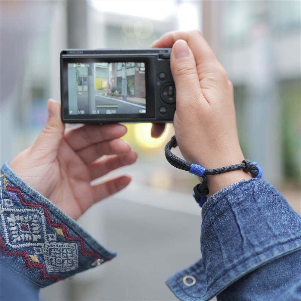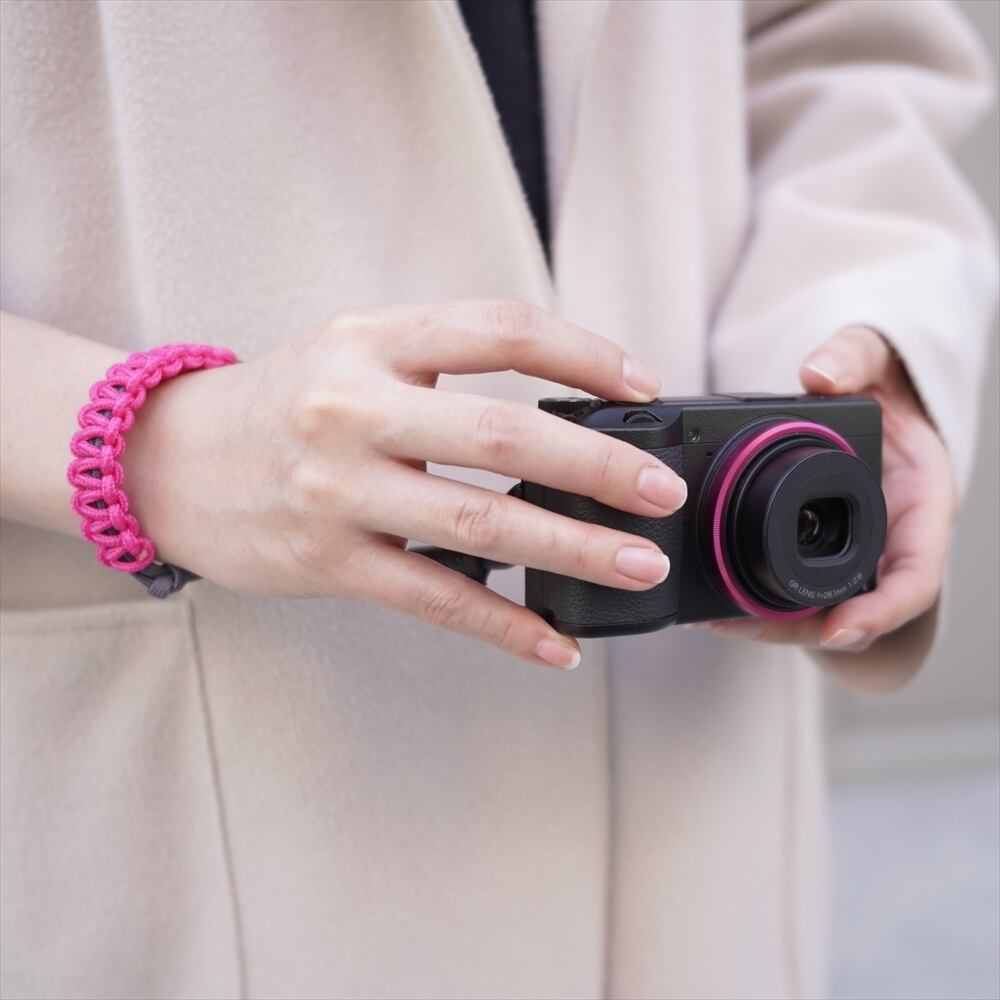 手首にフィットしてブレスレットのように見えるデザイン、持ち歩いても負担にならない軽さと、金属を使わずカメラを傷つけにくいパーツにこだわっています。